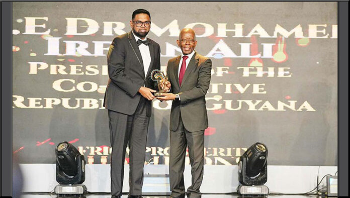 Irfaan Ali received the Global Leadership Award for transformational leadership from the Prime Minister of Mozambique, Adriano Maleiane in January of 2024.