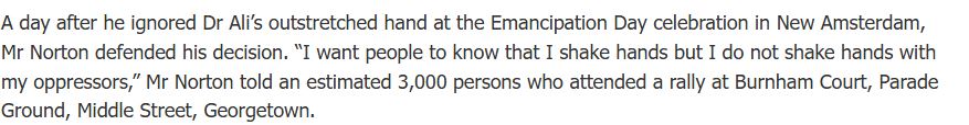 Remember, on January 11th January 2002, when Norton called for Desmond Hoyte’ s resignation, as the ‘Decent Thing’, after Hoyte lost five seats in 1997 but garnished 26 Seats and 40.55% of the total electorate, confirming a like-ability that Norton has never enjoyed nationally… a call he delivered in his political combat fatigues?