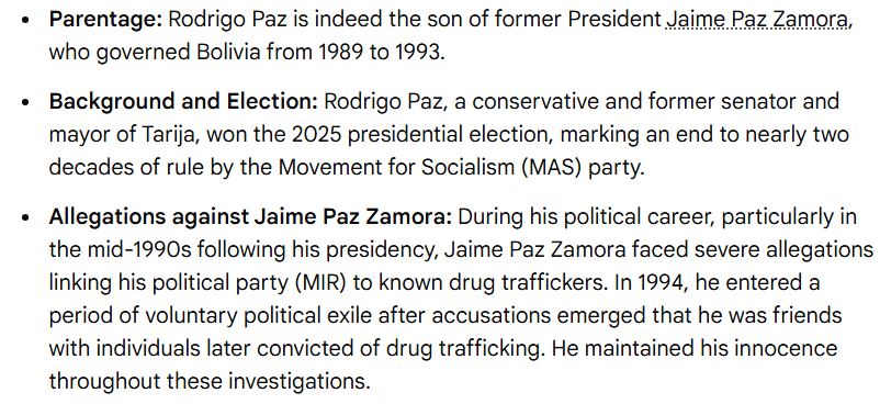 Bolivia’s President, Rodrigo Paz Pereira, for example, is son of former President Jaime Zamora Paz, known as a dirty handed public official linked to his nation’s drug trafficking.